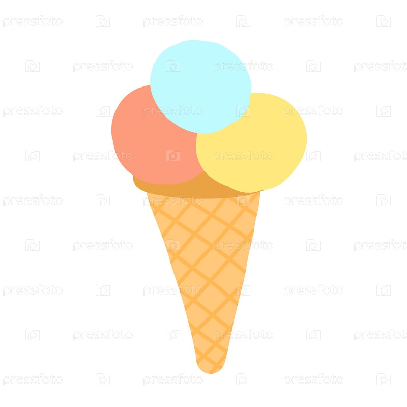 Иллюстрация рожка мороженого с тремя шариками в пастельных тонах: синем, розовом и желтом. Рожок имеет вафельную текстуру. Идеально подходит для летних тем, меню десертов или игривых графических дизайнов