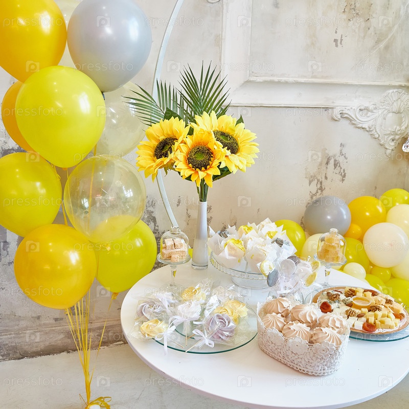 Вечеринка с желтыми и серыми шарами. День рождения, свадьба, помолвка, вечеринка по случаю рождения ребенка. Крупный план