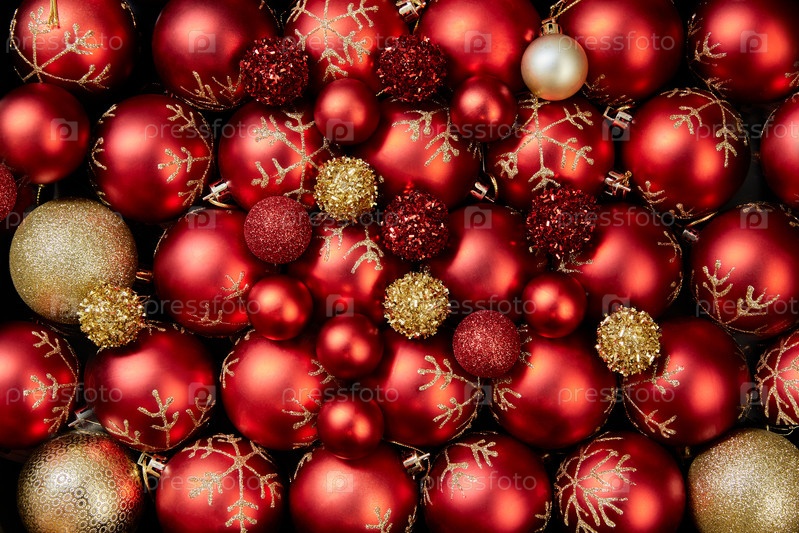 Открытка на Рождество или Новый год. Красные и золотые елочные шары. Фон для текста. Копировать пространство