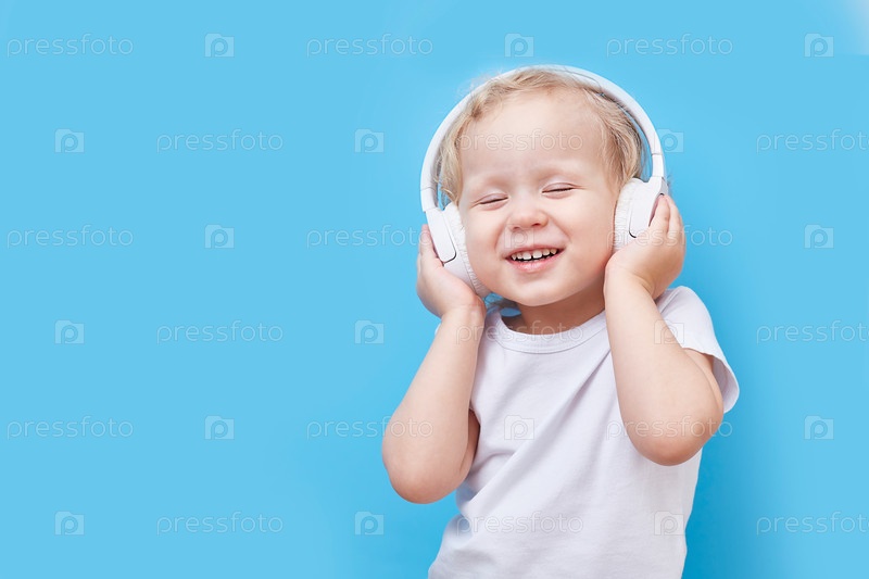 Наушники на голове ребенка. Слушает музыку и танцует. Копировать пространство