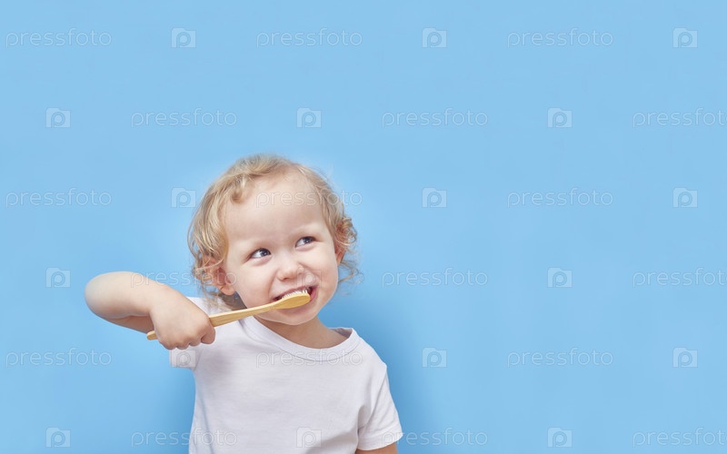 Ребенок чистит зубы деревянной бамбуковой зубной щеткой на синем фоне с местом для текста