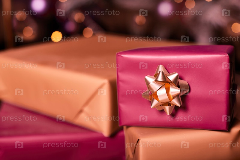 Коробки с рождественскими подарками под елкой. Декор на Новый год и Рождество. Цветные подарки на день рождения с бантом из ленты. Упакованные подарки в стопку. С новым годом 2022