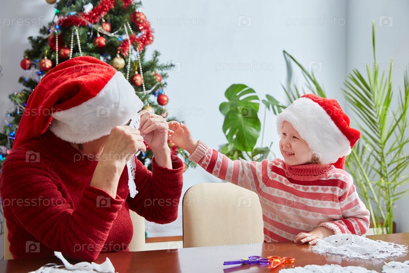 Ребенок и взрослый в шапках Санта-Клауса делают рождественские безделушки, чтобы украсить дом на Рождество. Счастливых праздников и Рождества с бабушкой