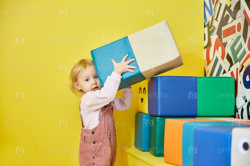 Улыбающийся ребенок строит дом из больших мягких кубиков. Копировать пространство