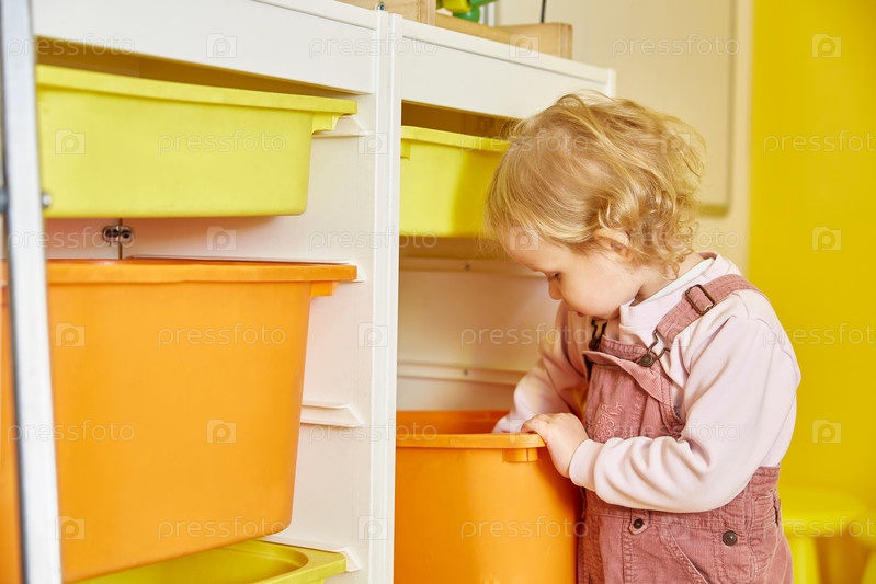 Кудрявая девочка роется в коробке с игрушками