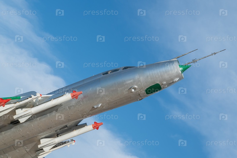 Боевой самолет истребитель-бомбардировщик на фоне голубого неба