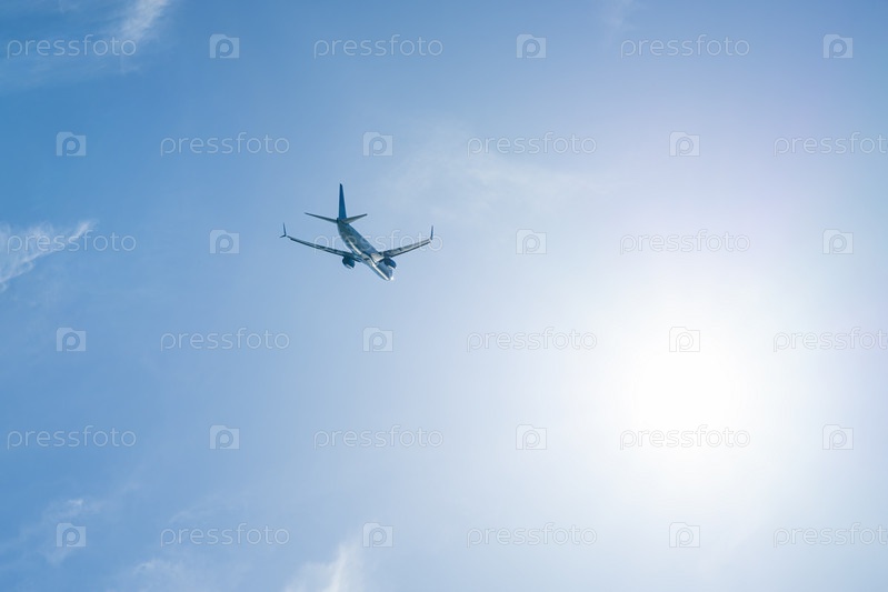 Самолет летит на фоне голубого неба