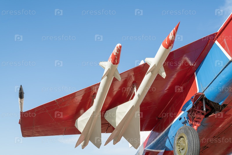 Боевой самолет истребитель-бомбардировщик на фоне голубого неба