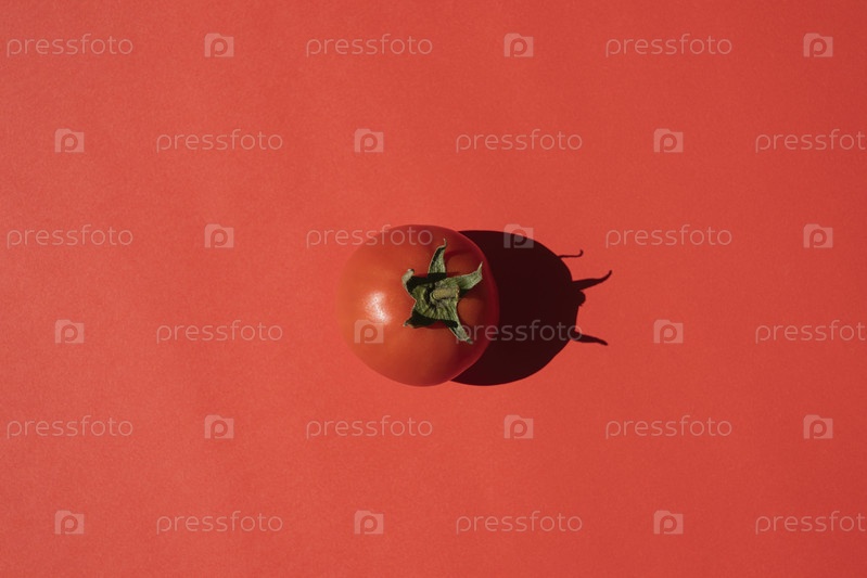 Красный помидор с резкой тенью на красном фоне