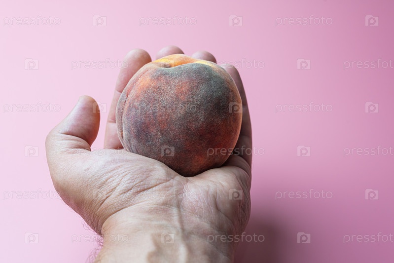 Спелый персик в руке мужчины на розовом фоне
