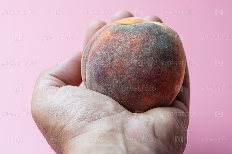Спелый персик в руке мужчины на розовом фоне