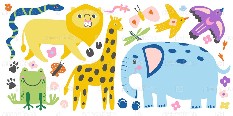 Игривые животные джунглей, такие как слон, лев, жираф, лягушка и змея, в ярких цветах вызывают ассоциации с тропическими приключениями, идеально подходят для тем дикой природы и забавных дизайнов природы