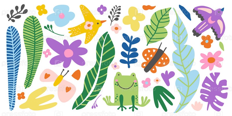 Яркая иллюстрация джунглей с зелеными листьями, красочными цветами, желтой птицей, лягушкой и бабочкой. Идеально подходит для детей, занимающихся тропической природой и дикой природой