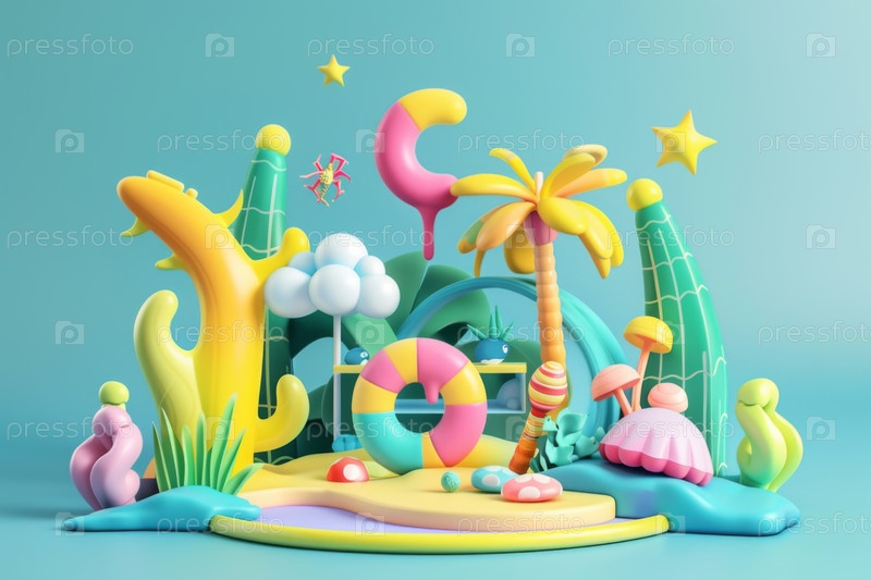 Яркие 3D-скульптуры на летнюю тематику с красочными элементами, такими как пальмы, облака и яркая тропическая атмосфера, идеально подходят для творческих экспозиций