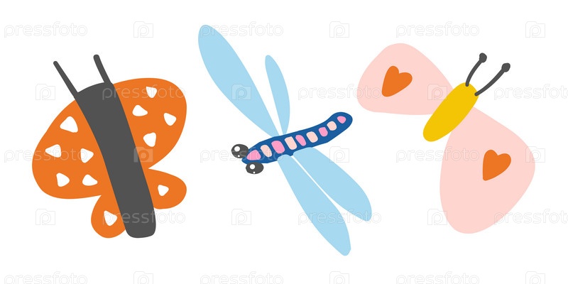 Яркие оранжевые и розовые бабочки с веселой стрекозой в синем. Причудливый и нежный дизайн, идеально подходящий для весенних или природных тем