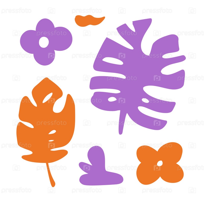 Яркие оранжевые и фиолетовые тропические листья в художественном оформлении. Привлекательные и яркие, подходят для креативных дизайнов, модных узоров и тропического декора