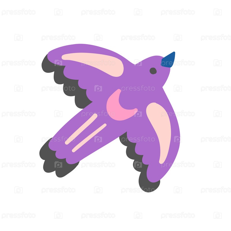 Элегантная фиолетовая птица с розовыми крыльями, грациозно летящая. Причудливый и красочный дизайн, идеально подходящий для экзотических или тропических произведений искусства и декора