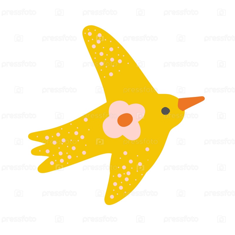 Желтая птица с оранжевым клювом и цветочными деталями. Причудливый и яркий дизайн для тропических, диких или декоративных художественных тем