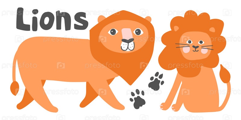 Милые львы с яркими оранжевыми гривами, игривыми выражениями и отпечатками лап. Идеально подходят для детских дизайнов, тем джунглей и вдохновленного дикой природой искусства