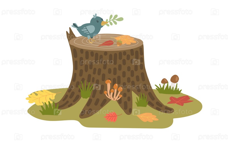 Очаровательная птичка, сидящая на пне дерева, окруженная грибами и осенними листьями. Идеально подходит для иллюстраций на тему природы, леса или осени