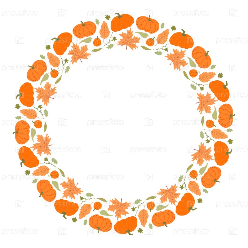 Осенний венок из оранжевых тыкв и осенних листьев на белом фоне, идеально подходит для праздничного дизайна, приглашений и сезонного декора