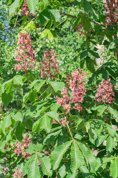 Цветущие весной конские каштаны с яркими розовыми цветами