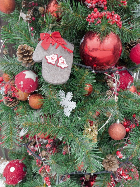 Празднично украшенная рождественская елка с варежками, игрушками и праздничным декором