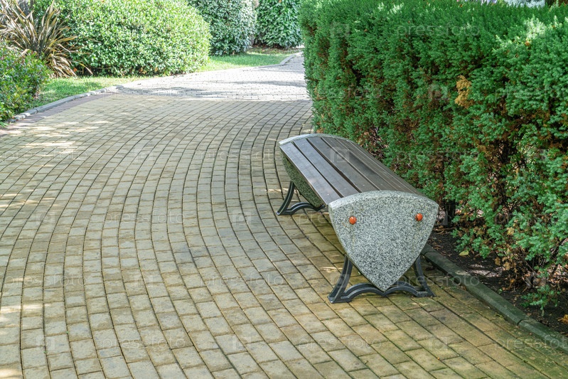 Современный дизайн скамейки в ландшафтном саду, окруженном зеленью