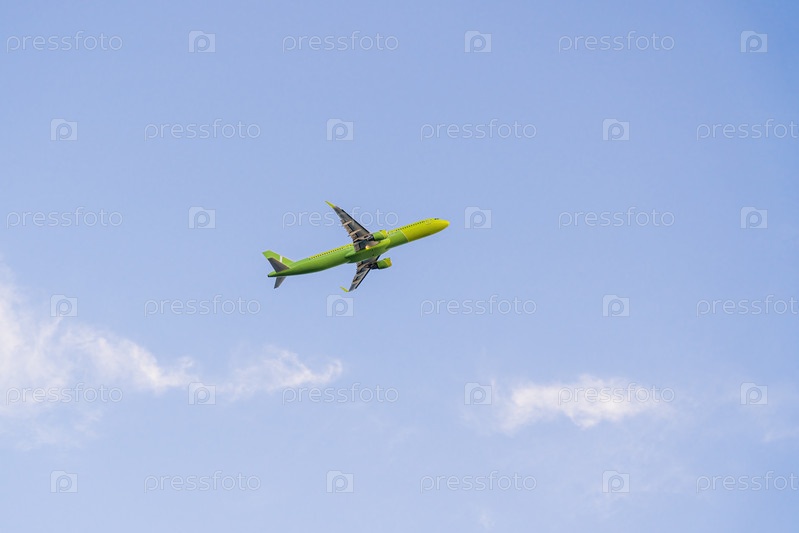 Зеленый самолет летит на фоне голубого неба