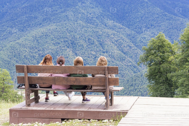 Девушки на скамейке любуются горным пейзажем