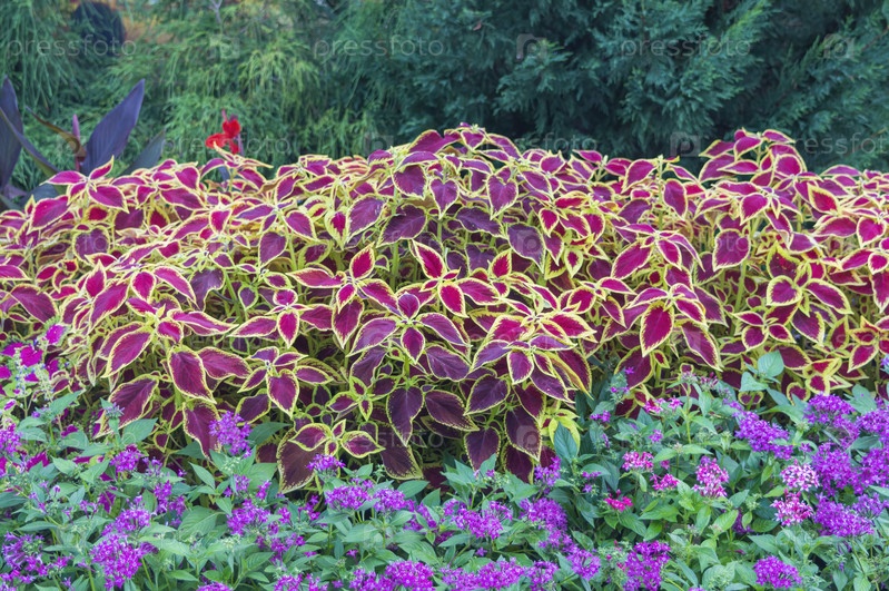 Клумбы с разноцветными цветами и растениями крупным планом