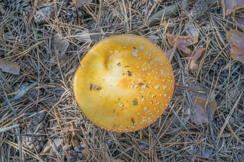 Гриб желтый мухомор крупным планом в сосновом лесу