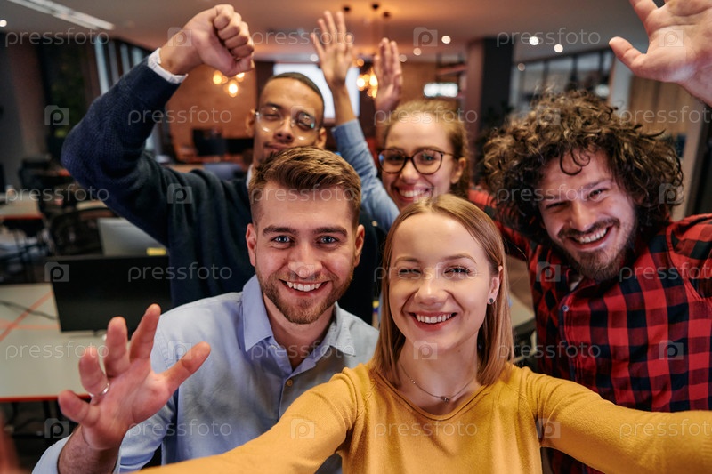 Группа разнообразных профессионалов в сфере бизнеса отдыхает от своих задач в современном офисе стартапа, чтобы сделать креативное селфи, демонстрируя командную работу и яркую корпоративную культуру