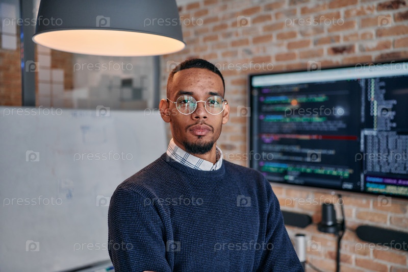 Лидерство в стартапе: афроамериканский бизнесмен в современном офисе с коллегами на заднем плане