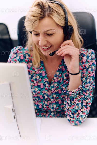 Дружелюбный агент колл-центра отвечает на входящие звонки с помощью гарнитуры и обеспечивает удаленное обслуживание клиентов