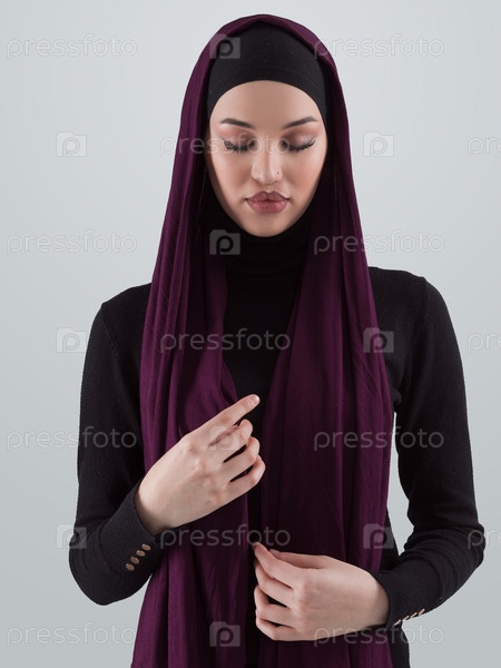 Мусульманка в современной стильной одежде и хиджабе изолирована на сером фоне. Разные люди моделируют концепцию моды хиджаба