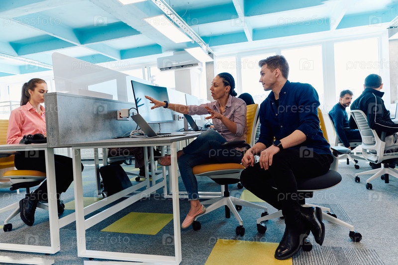 Совместный процесс многонациональной квалифицированной молодой бизнес-команды во время мозгового штурма в офисе. Разнообразная группа молодых людей, одетых в официальную одежду, сотрудничает в разработке дизайн-проекта