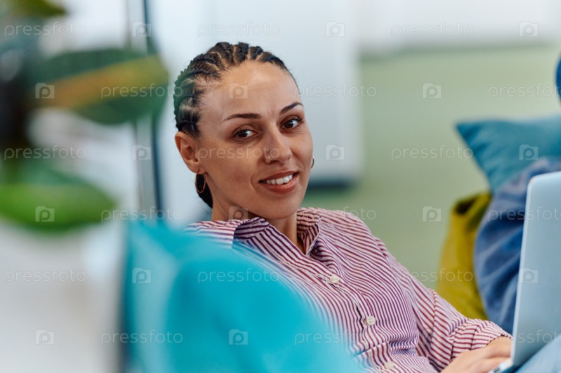 Современный программист обсуждает будущие бизнес-проекты с коллегами в современном офисе стартапа