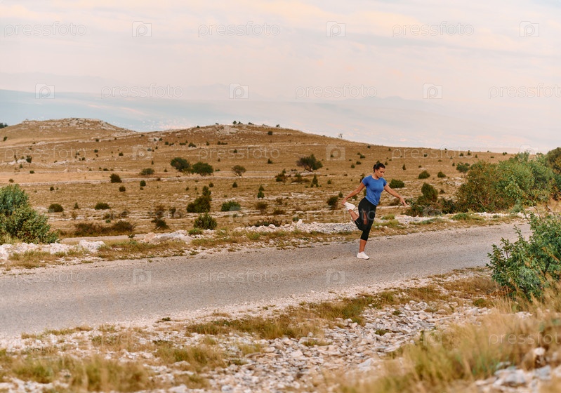 Решительная спортсменка делает растяжку после интенсивной пробежки по пересеченной горной местности