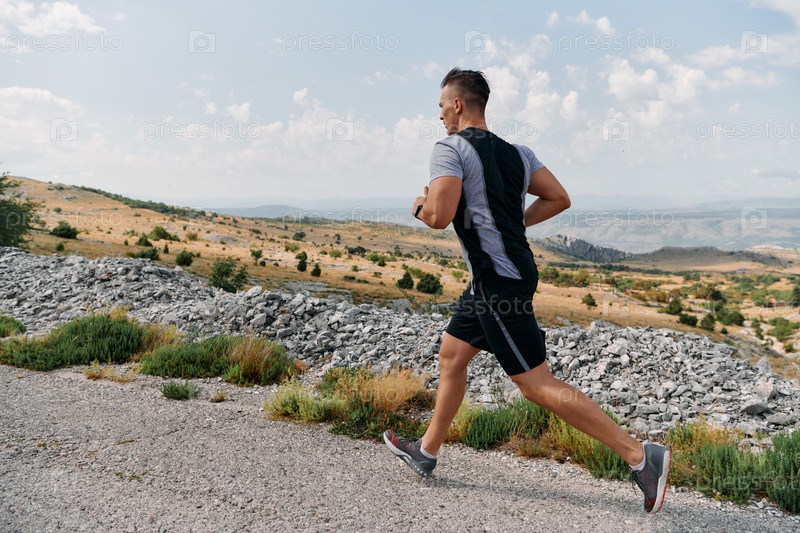 Решительный спортсмен бежит по пересеченной горной местности на рассвете