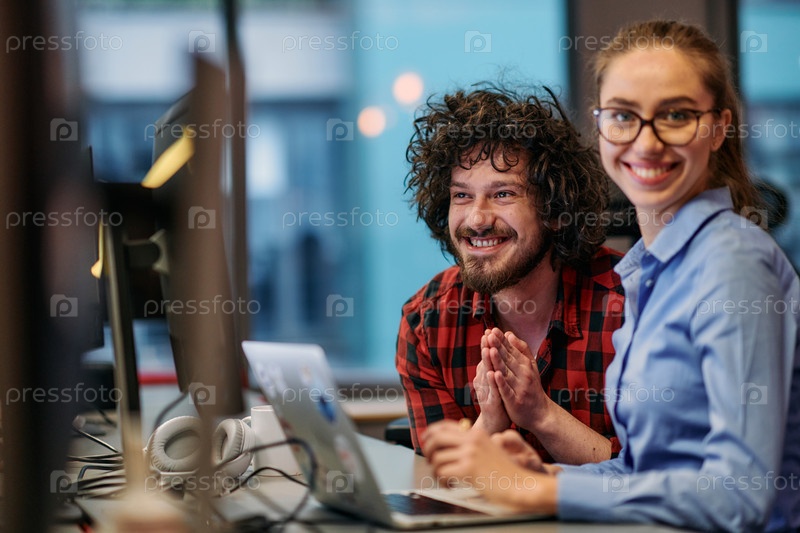 Коллеги по бизнесу, мужчина и женщина, обсуждают бизнес-стратегии, внимательно глядя на монитор компьютера, олицетворяя сотрудничество и инновации