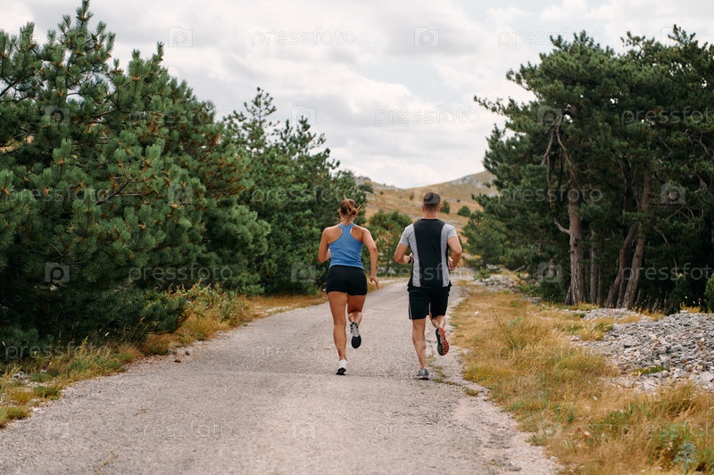 Пара в спортивной одежде бежит по живописной дороге во время утренней тренировки, наслаждаясь свежим воздухом и поддерживая здоровый образ жизни
