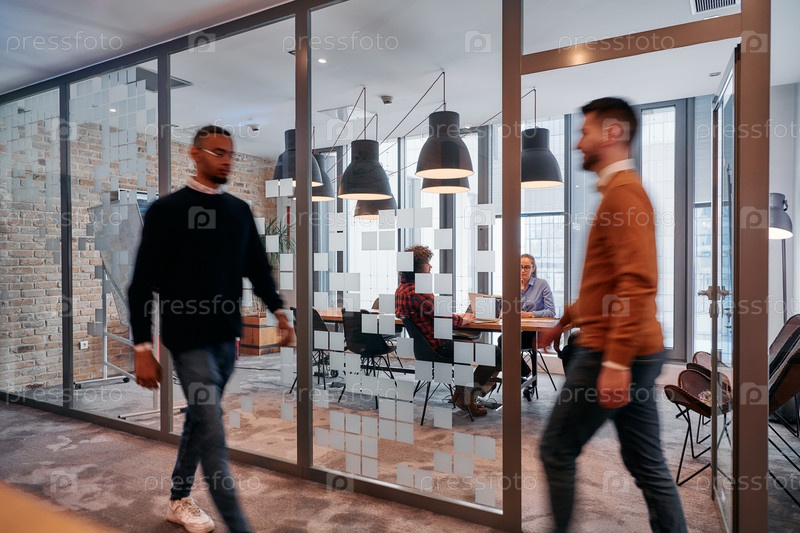 В динамичной суете деловой среды группа молодых специалистов идет по коридору рядом со своим офисом, в то время как их коллеги сотрудничают внутри, что символизирует командную работу и производительность