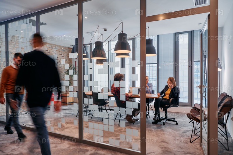 В динамичной суете деловой среды группа молодых специалистов идет по коридору рядом со своим офисом, в то время как их коллеги сотрудничают внутри, что символизирует командную работу и производительность