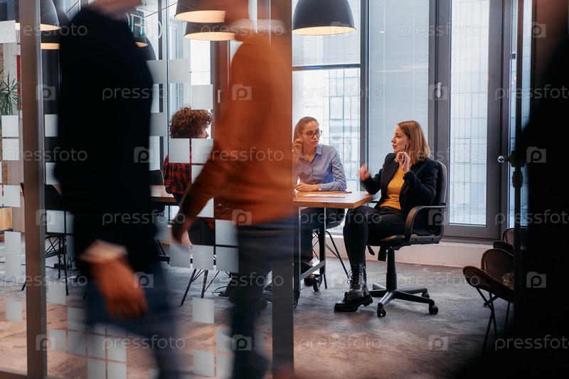 В динамичной суете деловой среды группа молодых специалистов идет по коридору рядом со своим офисом, в то время как их коллеги сотрудничают внутри, что символизирует командную работу и производительность