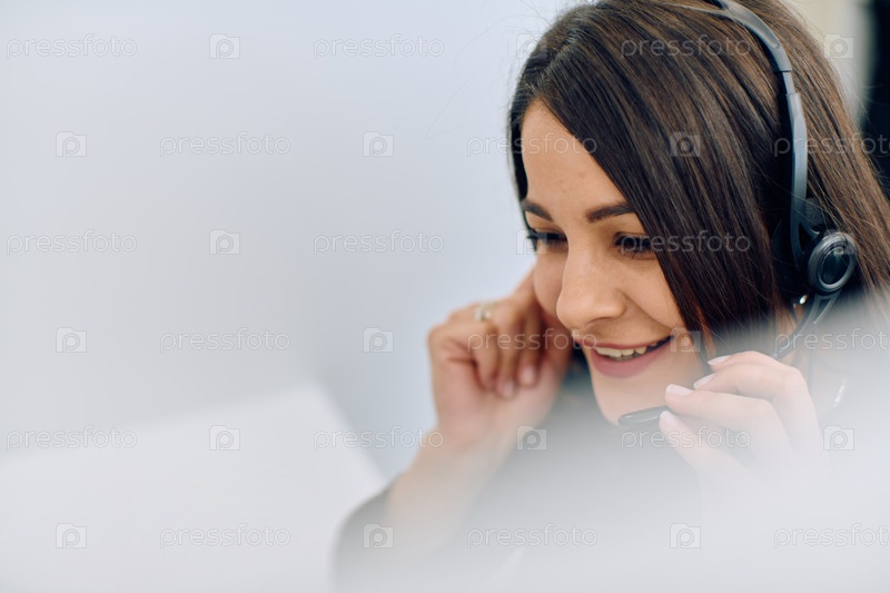 Дружелюбный агент колл-центра отвечает на входящие звонки с помощью гарнитуры и обеспечивает удаленное обслуживание клиентов