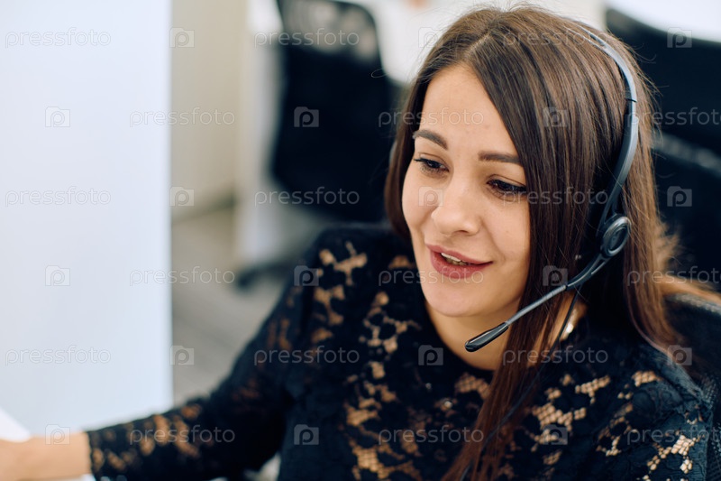 Дружелюбный агент колл-центра отвечает на входящие звонки с помощью гарнитуры и обеспечивает удаленное обслуживание клиентов