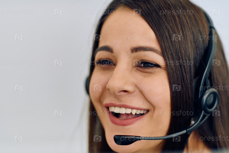 Дружелюбный агент колл-центра отвечает на входящие звонки с помощью гарнитуры и обеспечивает удаленное обслуживание клиентов