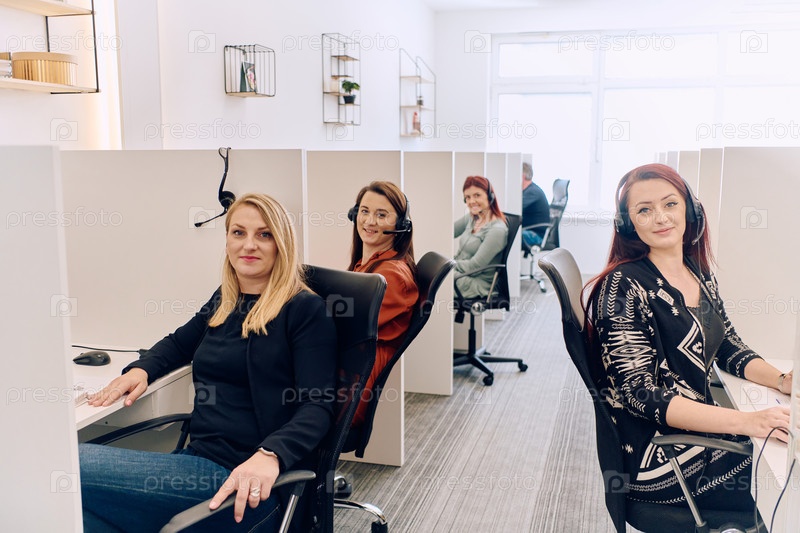 Команда женщин, оказывающих поддержку клиентам в колл-центре