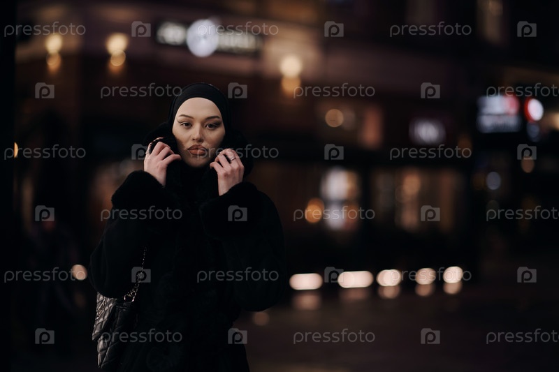 Мусульманка идет по городской улице холодной зимней ночью в хиджабе